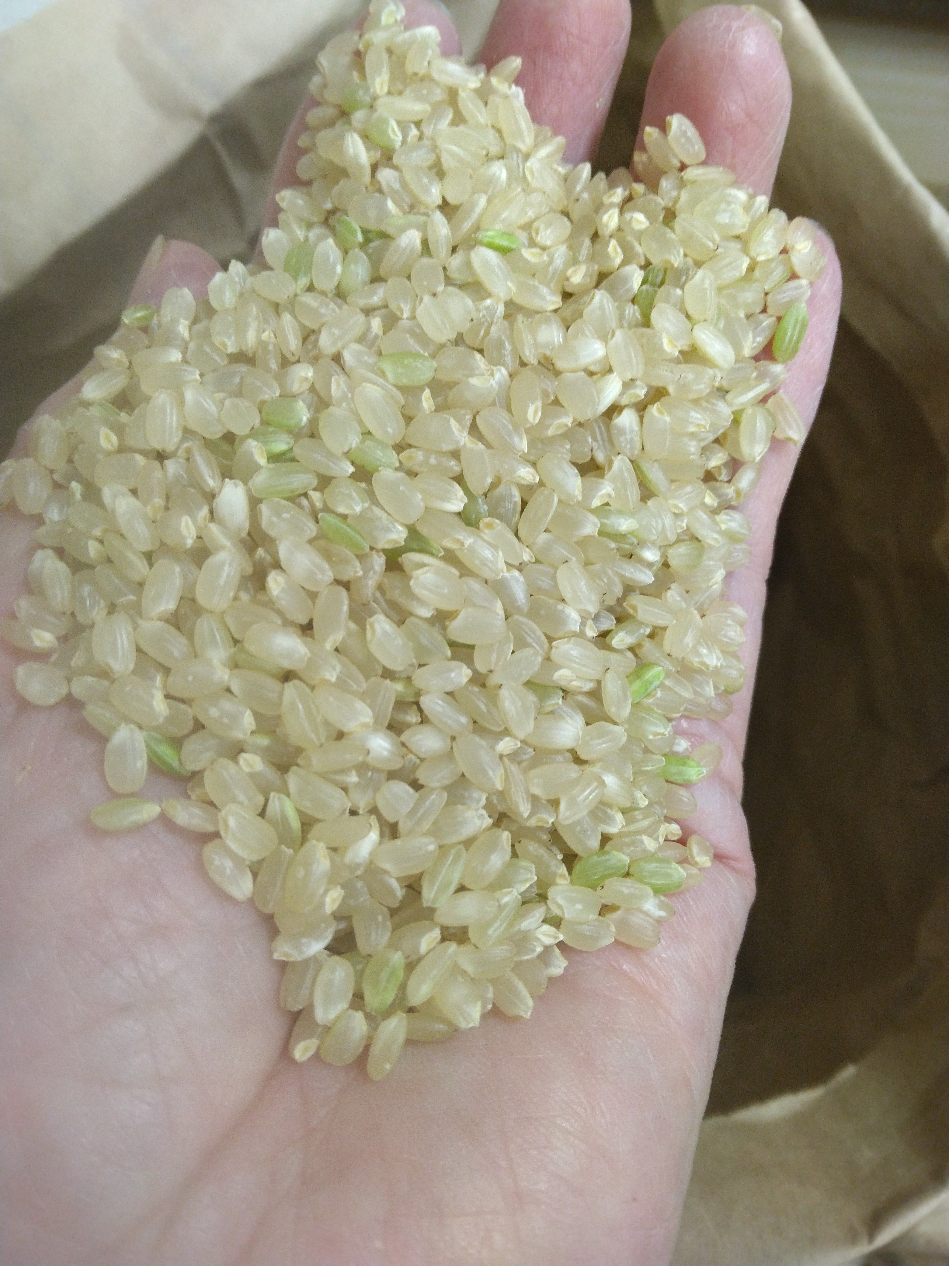 透明感のある緑の米が混じっています。活き青米です。未熟で青いのとは違います。 最後まで稲が元気であった印です。 味を良く知っている農家さんは、青米が混じる方が美味しいといわれます。